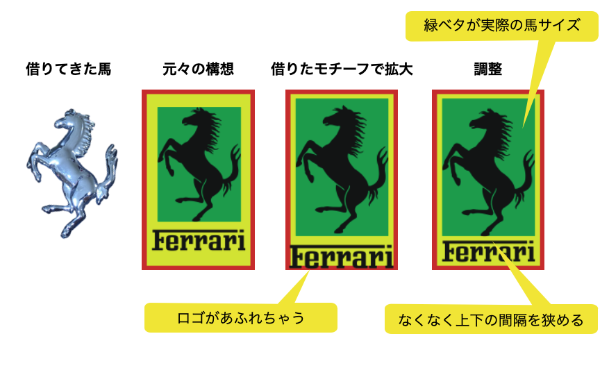 馬のモチーフとロゴの間隔を忠実にあけたかったけど、この馬のサイズでロゴを大きくしてしまうとアルフォートに収まらなくなる為断念。ロゴと馬の比率が本来のロゴより気持ち縮小。