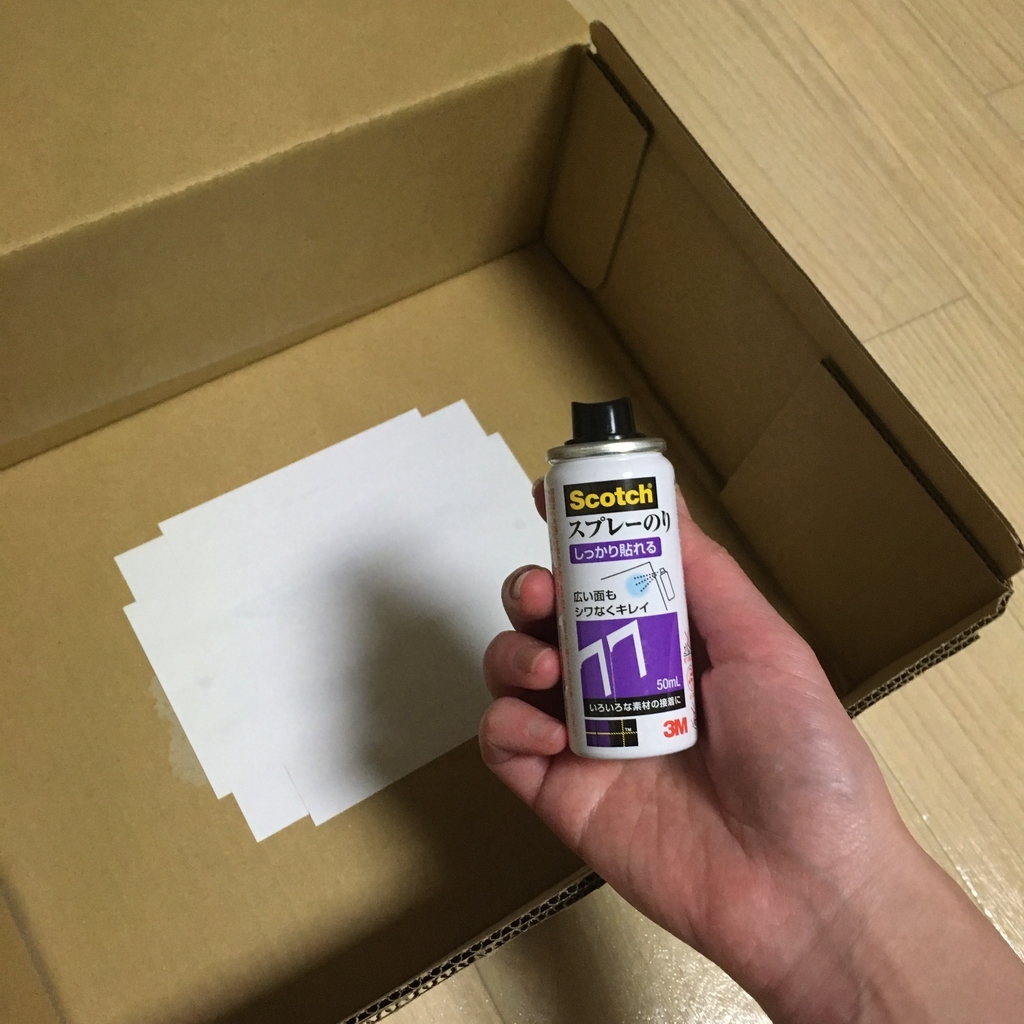 スプレーのりはダンボールの中でやる。新聞紙の上とかじゃダメ。ファァァ〜って舞うからね。