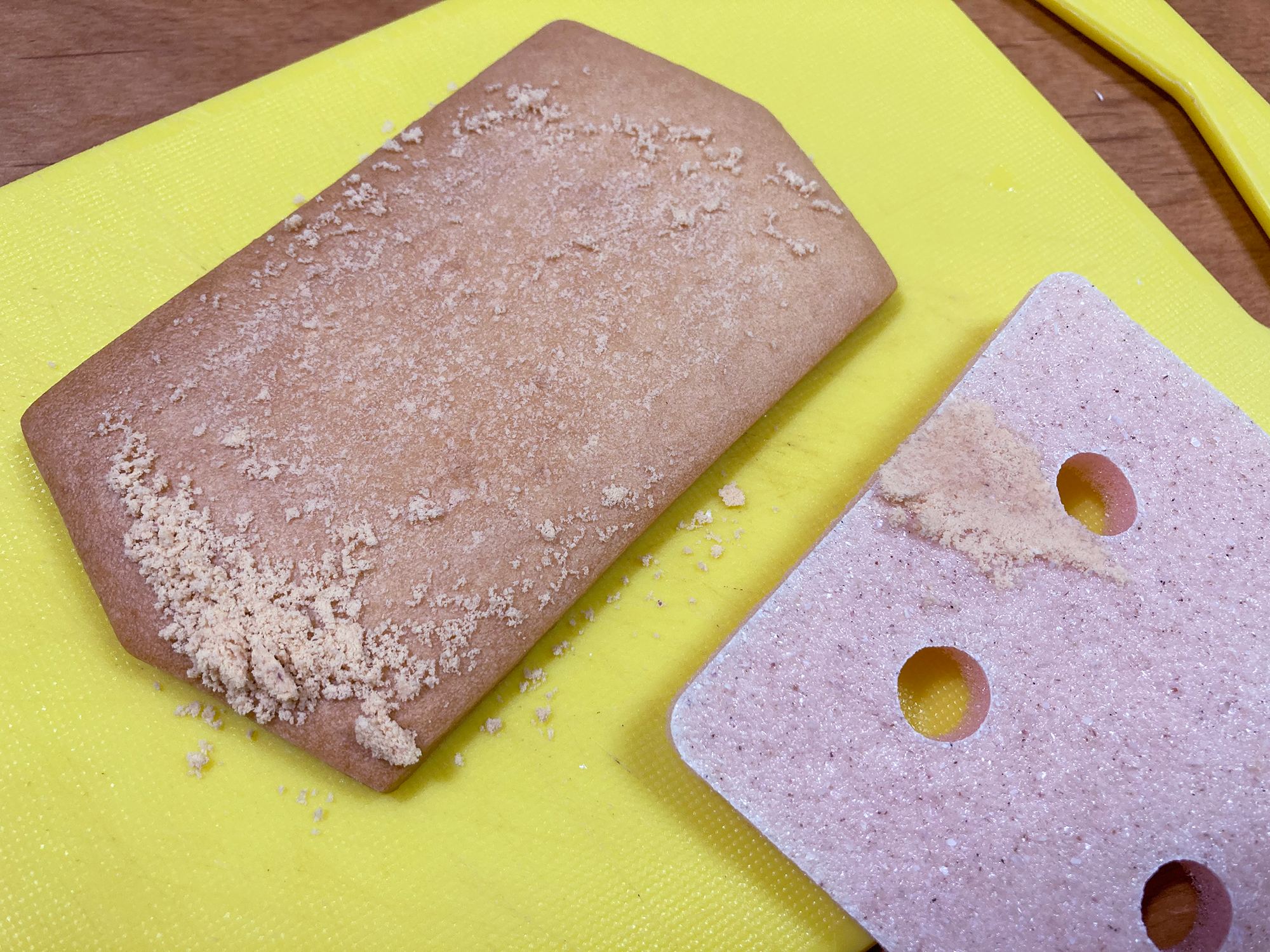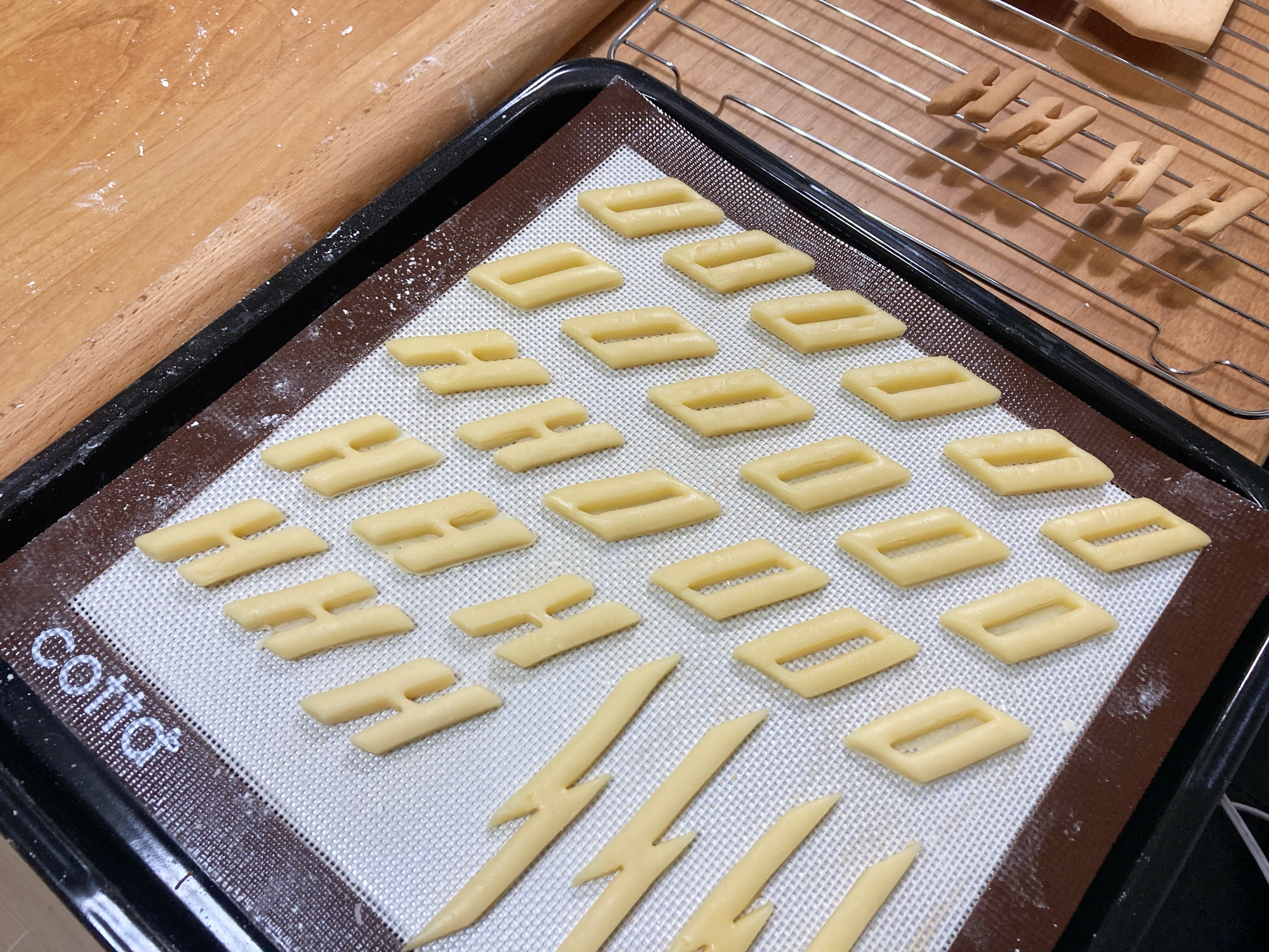 クッキー型は問題ないんですが、どうしても平面の多いロゴの方の出力が湾曲してしまい、平にするためにフライパンで温めて平な木で押し付けて水平にしました。(最近のプリンターではそんな事起きないのかもしれないけど)