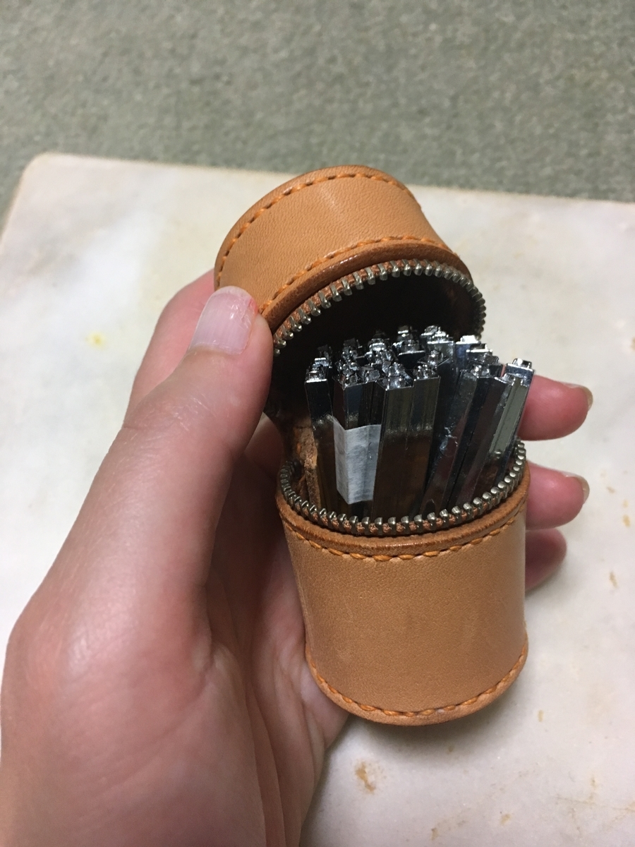 最初、母が革用のアルファベットの刻印を持っているのでそれを打ち付けようと思った。