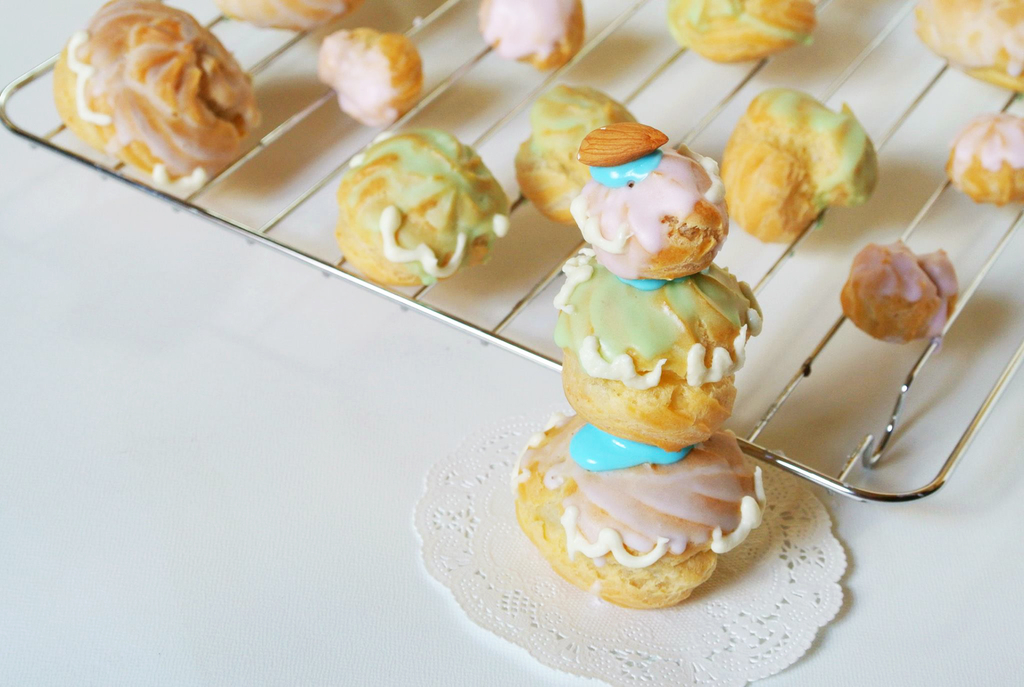それをかぶせて、ストローに竹串入れて、シュークリームをさしていく!安定!