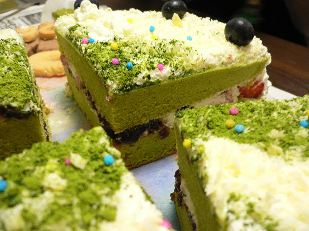 抹茶のスポンジケーキにあんこをサンド。ホワイトチョコでデコレーション。